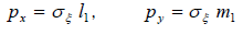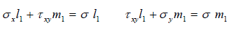 - 그림 3.1에서, P는 면 bc에 작용하는 합응력이며 p2 = σξ2 + τξη2이다. 면 bc의 길이를 1로 두면, 방향 여현을 이용해서, AB=m1, AC=l1이 됩니다. 평판 중의 요소 ΔABC에 작용하는 힘의 평형 조건을 고려하기 위해, 면 BC에 작용하는 힘의 x, y 방향 성분을 각각 아래와 같이 둡니다.