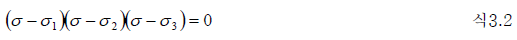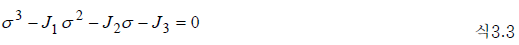 - 주응력은 좌표축의 선택 방법에 의존하지 않는 값이므로 임의의 응력 상태가 정해지면 J1, J2, J3 는 장소에 의해 정해지는 일정치가 되며, 이것들 각각을 제1차, 제2차, 제3차 응력 불변량이라 부릅니다. 식 3.1과 3.3은 원래 같은 것이었고, 양자의 계수를 비교해보면,