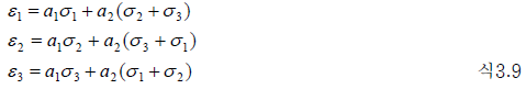 - 식 3.8로부터, 전단 응력이 작용하지 않는 좌표계에서는 전단변형률도 0이 되기 때문에 응력의 주축과 변형률의 주축이 일치한다는 것을 알게 됩니다. 따라서 주축 방향의 변형률에 대해서는 아래의 식이 성립합니다.