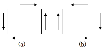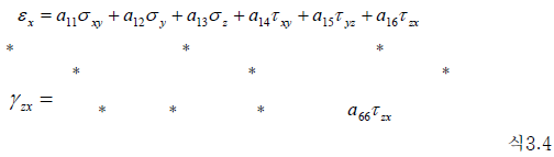 - 식 3.4의 제 1식을 예로 들어서 생각해 보면, τxy가 작용한다면 εx에 영향을 미칠 가능성이 있다는 것을 의미합니다. 그러나 실제로 이러한 것은 일어날 수 없습니다. 만약 a14 > 0이라면, 그림 3.1(a)과 같이 정의 τxy 가 작용할 때, εx > 0 가 됩니다. 즉, x방향으로 늘어나게 됩니다.