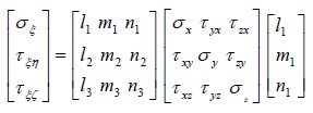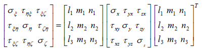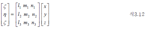 x-y-z좌표계와 ξ-η-ζ 좌표계사의 좌표 변환은 방향 여현을 이용하게 되며, 이 관계를 매트릭스로 표시하면 다음과 같습니다.