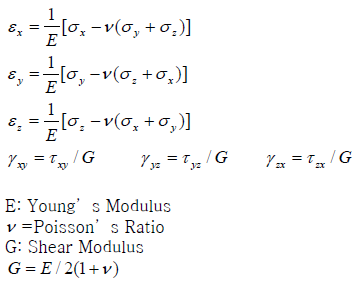 - 가 되고, 등방균질성 재료에 대한 일반화된 Hooke의 법칙을 얻을 수 있습니다.