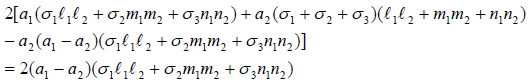 - 위 식은 l1 = m1 = 0 혹은 l1, m1을 미지수로 하는 2원 일차연립방정식의 계수 행렬식이 0이 되는 것을 요구합니다. 방향 여현의 성질에서 보면, l1=m1=0의 경우는 없으므로 다음 식이 성립해야만 합니다.