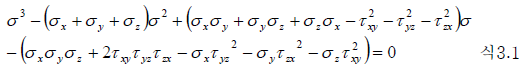 - 3차방정식 식 3.1을 푸는 것이 아니라, 풀지 않고 얻어진 이상의 성질을 이해하는 것이 중요합니다. J1은 응력 상태의 정수압(hydrostatic)성분의 크기 및 응력과 변형률의 관계(Hooke의 법칙)에서 체적 변화에 관계하는 량입니다. J3는 소성변형의 원인으로 알려지는 량의 크기이며 J3의 의미는 J1, J2 만큼 명확하게 알려져 있지는 않습니다.