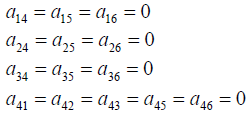 - 반대로, (b)의 경우와 같이, 의 경우에는 x방향으로 줄어드는 것이 됩니다. 그러나 (a)의 경우를 뒤에서 보면 (b)와 같이 되고 이때에는 εx < 0 가 됩니다. 이렇듯, a14 > 0 이라면 모순되는 결과가 되고, 마찬가지로 a14 < 0 라고 해도 동일한 모순에 빠지게 됩니다. 결국 a14 = 0 이 아니면 안 되게 됩니다. 식 3.4의 각 식에 대해 동일한 고찰을 하면, 아래의 관계를 얻을 수 있습니다.