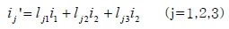 - ljp를 새로운 좌표계의 j 번째 축과 옛 좌표계의 p 번째 축 사이의 각도의 여현으로 표시합시다. 다음으로 옛 좌표계에 대한 ij´의 방향여현은 li1, li2, li3 이다. 이것은 다음과 같이 나타낼 수 있습니다.